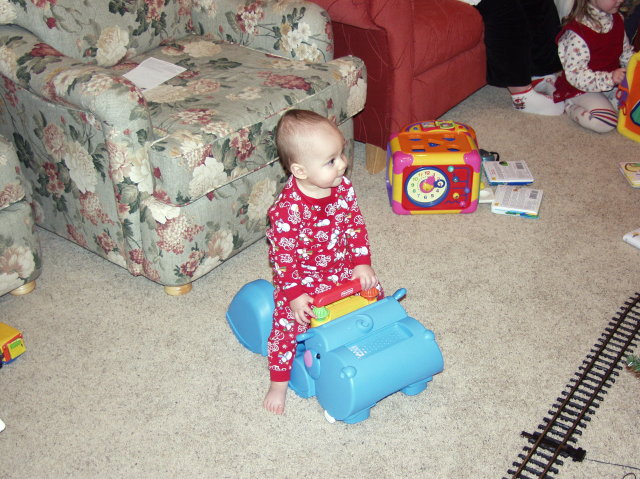 Jacob sits on Hippo toy vacuum.