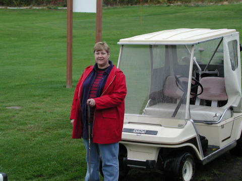 Kathy, note her hair and the rain on the cart window